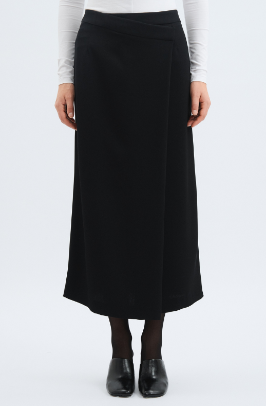 Переднее полотнище с двумя талиевыми вытачками и глубокой асимметричной складкой, имитирующая запах. Заднее полотнище со средним швом и двумя парами талиевых вытачек. Пояс притачной, подкройной, шириной 4,0 см. Застежка на тесьму-молнию в среднем шве заднего полотнища. Молния до верхнего края пояса.