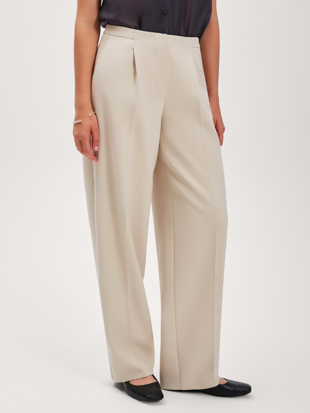 Брюки свободного силуэта с небольшим заужением к низу, средней посадки, с застежкой на брючную молнию и крючок. Верхний край пояса располагается ниже естественной линии талии на 4 см.