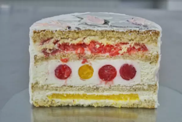 Создавая это сочетание, хотелось передать «вкус лета»: освежающий мятно-лаймовый бисквит,в сочетании с нежнейшим муссом,в составе которого клубничные и апельсиновые желейные "шарики". В прослойке торта клубничный конфитюр и апельсиновый слой.