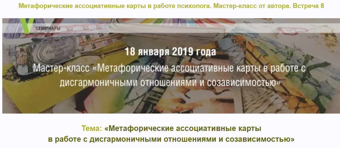 На мастер-классе мы поговорим о том, как работать с созависимыми клиентами и как с помощью метафорических ассоциативных карт мягко и безболезненно помогать им на пути осознавания и изменения собственного дисфункционального поведения.