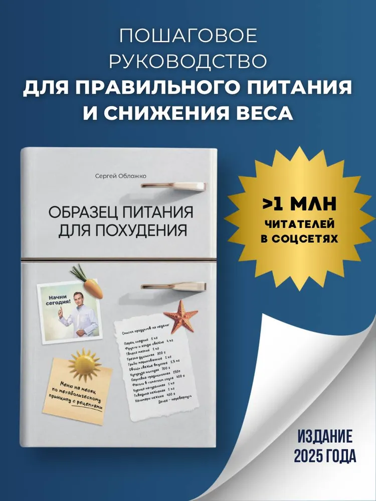 Книга врача-психотерапевта и диетолога Сергея Обложко «Образец питания для похудения. Меню на месяц по метаболическому принципу с рецептами» - первый шаг для тех, кто хочет на себе проверить эффективность разработанного Сергеем Обложко метода и, как и сотни тысяч его учеников, за первые недели уже увидеть результат на весах. В книге приведено 80 проверенных рецептов на каждый день, представлены примеры компоновки блюд в разные приемы пищи и даны ценные рекомендацию и лайфхаки по снижению тяги к сладкому, безопасным перекусам и правильным разгрузочным дням. Они вас точно удивят и обрадуют.
