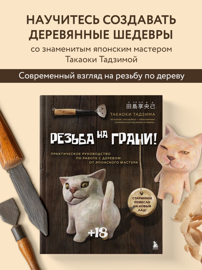 Откройте современный подход к резьбе по дереву вместе с Такаоки Тадзимой — знаменитым японским скульптором, чьи работы выставляются в крупнейших галереях мира. Его книга вдохновит как начинающих, так и опытных резчиков, приглашая раздвинуть границы и по-новому взглянуть на искусство создания деревянных фигурок.